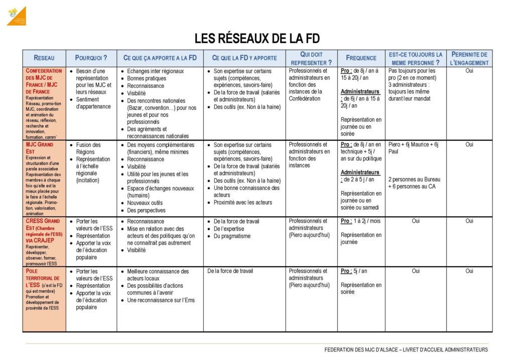 Les réseaux (associatifs et employeurs) de la FD : MJC de France, MJC Grand Est, CRESS, CRAJEP…