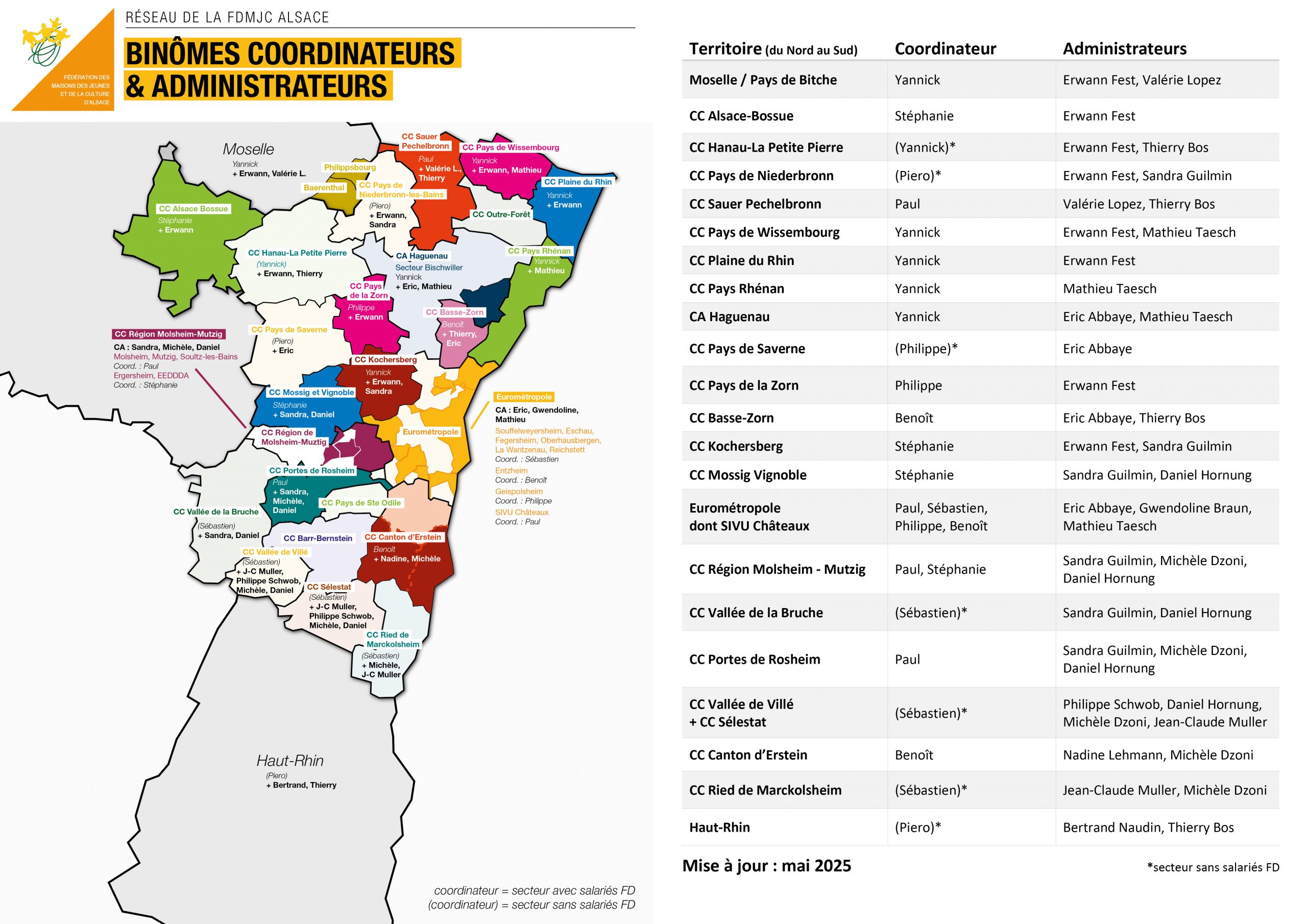 Répartitions des secteurs avec binômes coordinateurs départementaux et bénévole du Conseil d’Administration